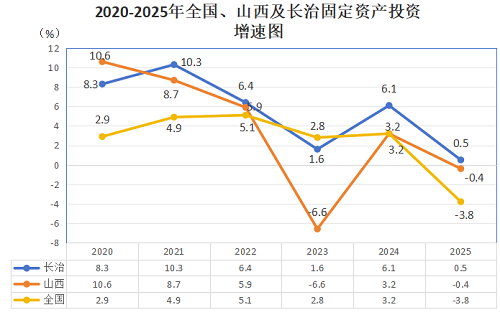 2021-2025年间,长治市固定资产投资增速分别为10.3%、6.4%、1.6%、6.1%和0.5%,年均增速4.9%,比同期全省平均增速(2.2%)高出2.7个百分点,比同期全国平均增速(-1.3%)高出6.2个百分点。2025年作为收官之年,全市实施项目(含房地产)2967个,新开工1728个,完成投资1027.1亿元,实现“十四五”圆满收官。