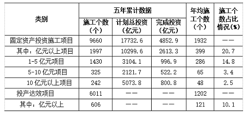 五年累计实施亿元以上项目1997个,占全部投资比重20.7%,计划总投资10299.6亿元,完成投资2613.3亿元,占全部投资比重53.9%。其中1-5亿元以上项目1430个,完成投资996.9亿元;5-10亿元项目325个,完成投资522.2亿元;10亿元以上项目242个,完成投资800.8亿元。