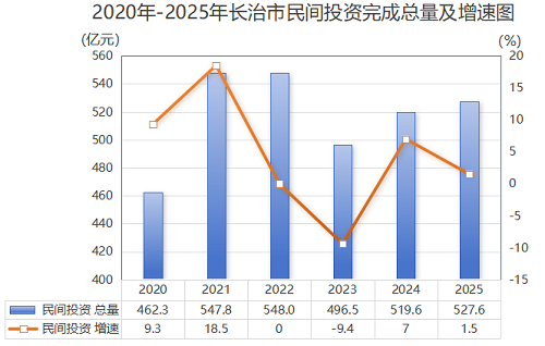 五年间累计完成民间投资2639.4亿元,年均投资527.9亿元,年均增速2.7%,占全部固定资产投资比重54.4%。民间投资增速在2023年探底后,2024年重回7.0%的较高增速,体现了长治市民间投资较强的韧性。