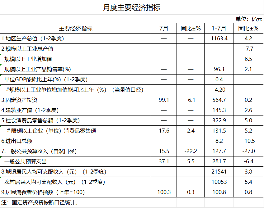 2025年7月长治市主要经济指标